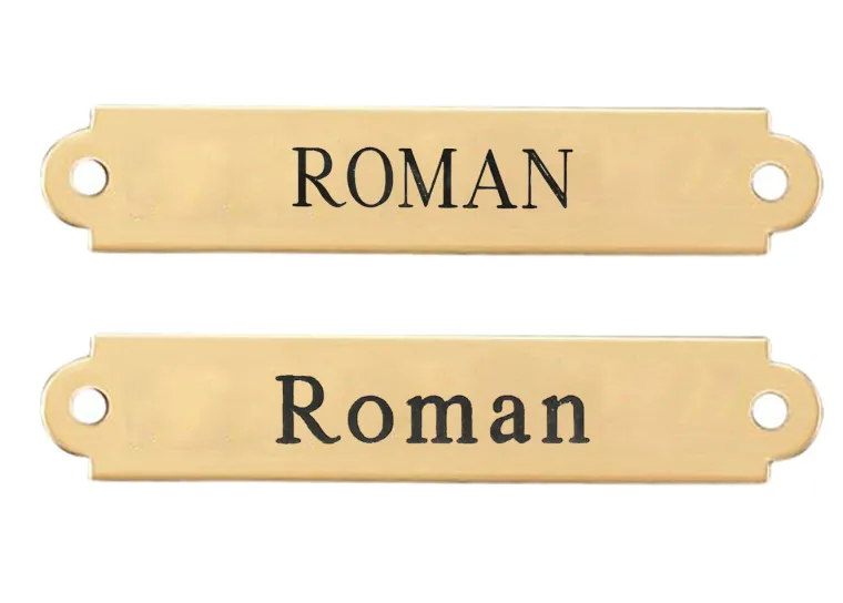 | Color | Block, Brass, German Silver, Old English, Roman, Script |