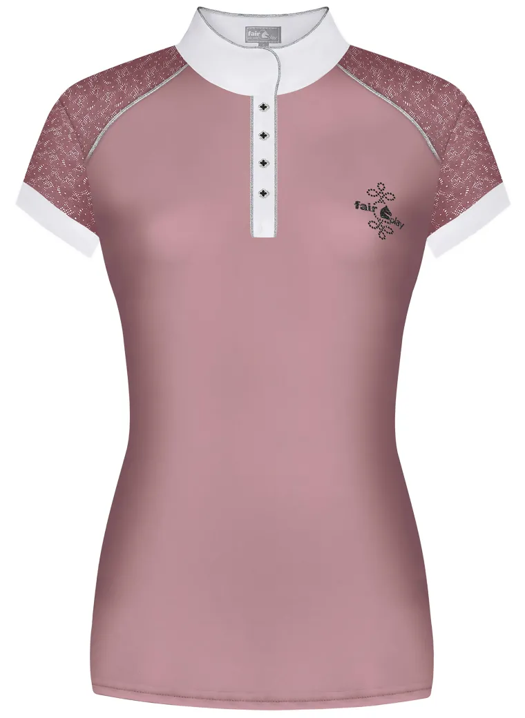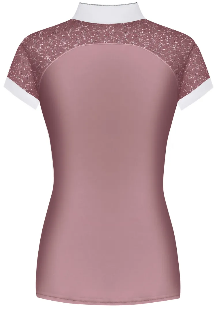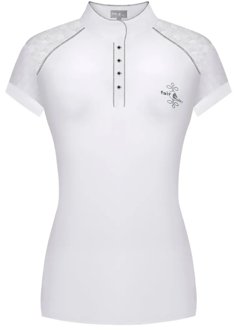 Elastic lace on the sleeves and front and back shoulders is a feminine touch that also adds airflow. Shimmering piping trims the collar, four-button placket and front shoulders. This competition top is proudly made in Poland and suited for formal lessons and clinics as well as shows.