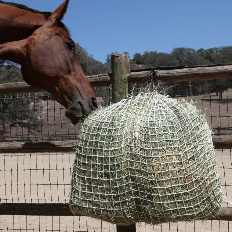 The Freedom Feeder Day Net is designed to provide a full day of hay. It comes in 1″, 1.5″ or 2″ mesh openings, measures 40″ x 30″ and holds up to 25 pounds of forage hay. It is top loading made with drawstring cord. Comes with a large carabiner for hanging.