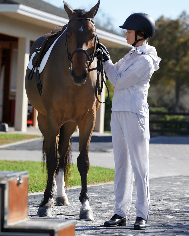 The Stride™Hilo H2O Jacket with waterproof, seam-sealed construction is so lightweight and stretchy, you’ll barely know you’re wearing it. Perfect for hot, rainy days, it is also a great choice for keeping clothes dry and clean when you bathe or clip your horse. For the ultimate convenience, the Hilo zips into its own pocket and secures with a belt around your waist as soon as you don’t need it.