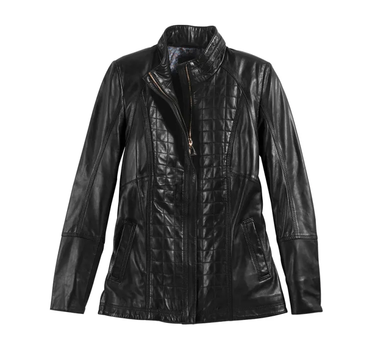 The genuine lambskin leather of this Moto Leather Jacket has a quilted, antiqued black finish for a head-turning look. Embellished with topstitching and styled with drop shoulders, our exclusive jacket has two welt front pockets and an interior zip pocket.