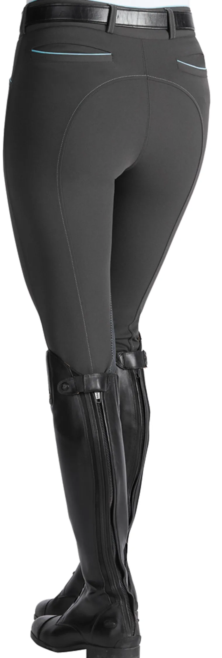 Designed to fit your curves without gaping at the waist, this breech features the mid-rise EquiTrue Rise™. It maintains a flattering, secure fit no matter how you move. It sits just below the belly button on most riders and suits every build well. The soft, covered waistband and seat won’t slide, slip, pinch or bind when you groom or ride.