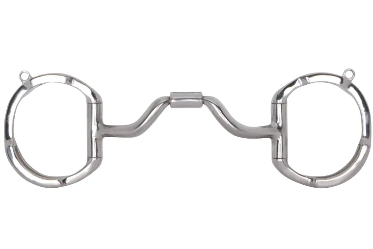 This mouthpiece applies little to no tongue pressure, working primarily off the bars, chin and poll. The bridle and reins slots, along with curb hooks, aid in Independent Side Movement™, which allows the rider to isolate one side of the bit for bending and lifting the shoulder while balancing the mouthpiece in the bridle. Stainless Steel with copper inlay.