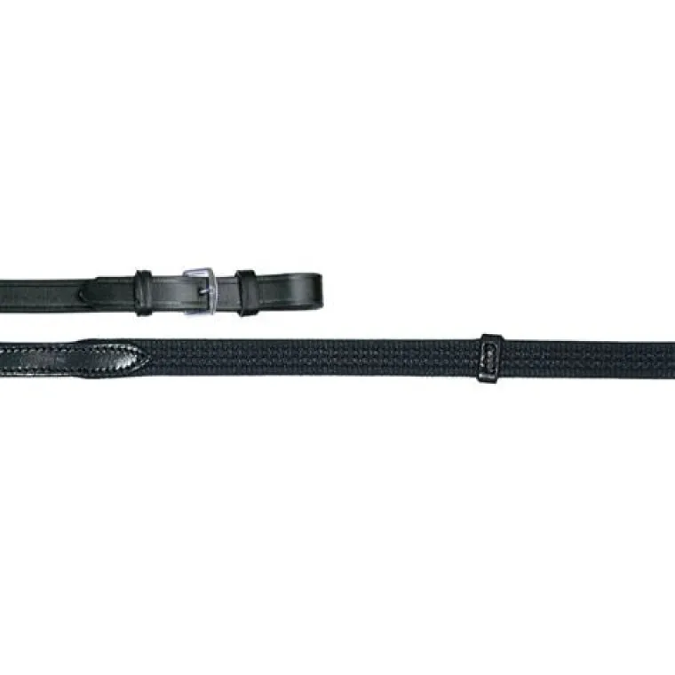Tory Leather Company Economy Web Reins are a great choice for daily riding. Theycombine bridle leather fronts with buckle ends and cotton webbing with leather hand stops to provide a comfortable grip. Black.