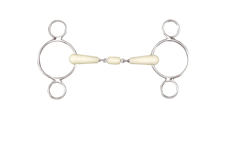 The Happy Mouth Bits® Double-Jointed 2-Ring Elevator bit features a mouthpiece covered in soft, flexible, yet extremely durable, apple-scented plastic. This mouthpiece material encourages bit acceptance and softness. Core and rings are stainless steel. Allows reins to be attached to cheeks or lower ring.