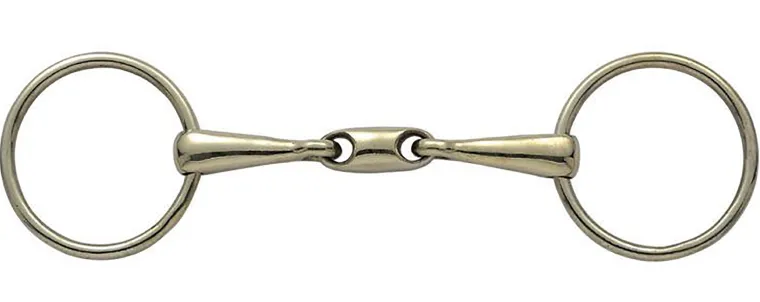This Loose Ring Copper Alloy Training Bit with 18mm mouth has anoval center link. The design helps eliminated the nutcracker action of a single-jointed bit. The gentle rounded link is also made of copper to encourage salivation. 65mm rings.