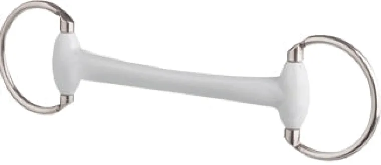 The bar is a solid, soft rubber/plastic piece. The ring size of the 4¾ bit is 6cm to better suit a smaller horse. Bit sizes 5 1/8″ and 5 1/2″ have 7cm rings.