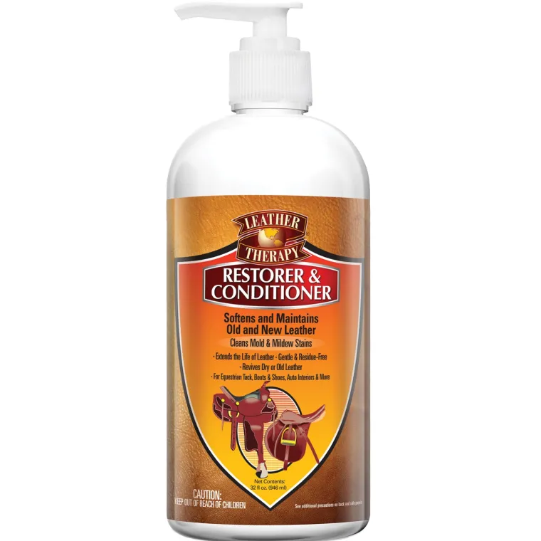 Leather Therapy® Restorer & Conditionermakes all your leather look and feel great. It easily removes mold and mildew from old leather and shortens the break-in time of new leather. This leather conditioner helps makes your leather soft, supple and strong without leaving behind any sticky or greasy residue. Formulated to condition from the inside out, it protects leather from life-shortening enemies such as sun, wind, moisture and more. Tests show a significant increase in leather tensile strength after using this conditioner. Environmentally-friendly and biodegradable. 32 ounces.