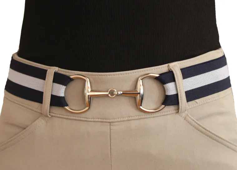 This EmEq Snaffle Bit Belt is a fun and functional accessory for any rider. It is handmade from durable, stylish 1.5″ wide elastic material that can be hand washed. An equestrian-inspired buckle and matching slide adjustment secures it to any size waist from 18″ to 44″.