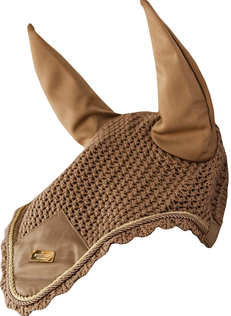 The Equestrian Stockholm Classic Ear Bonnet is a luxurious design offering protection against insects. Breathable crocheted body and stretchy cloth ear covers for minimal friction. Accented with double-row cording and a logo badge.