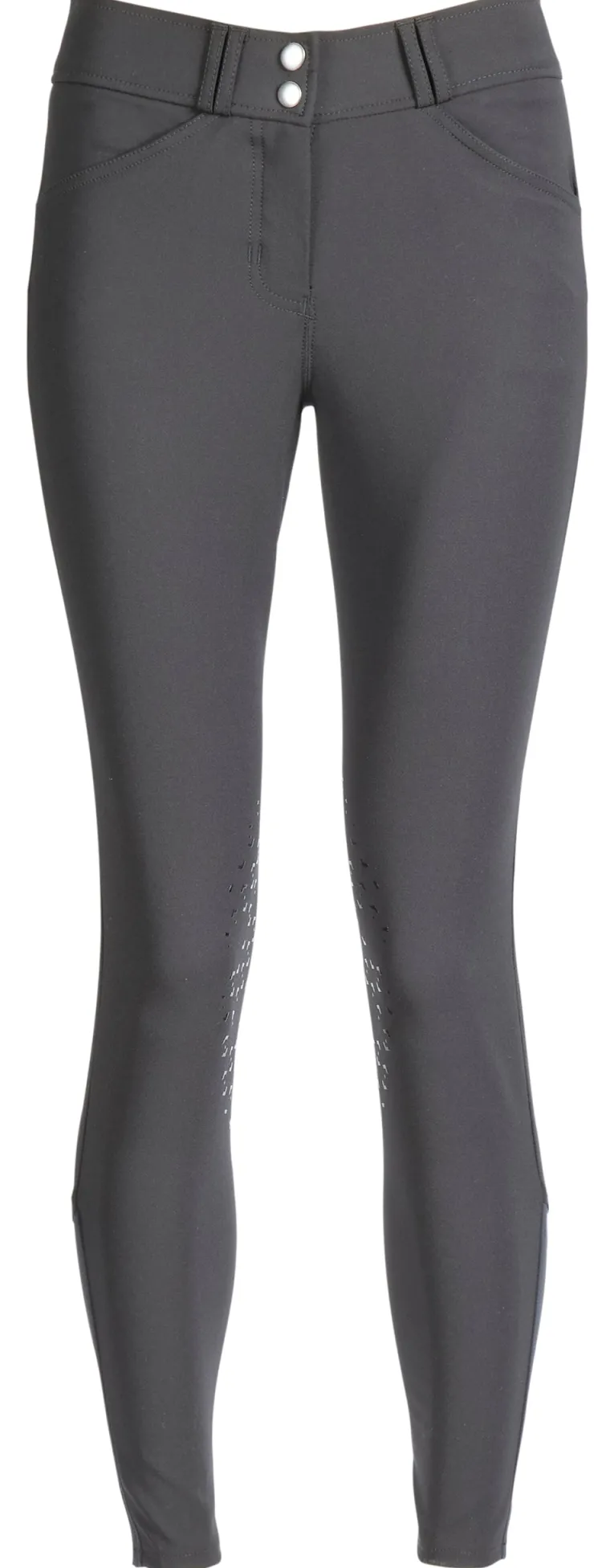 Single-layer, high-stretch calf panels provide a custom fit, eliminate bulk inside boots and allow easy on/off. Front slash pockets are made of low-profile stretch material for a no-show appearance on the outside and enhanced comfort on the inside. Flap back pockets on all colors except show tan are low-profile. Silicone knee patches feature a stylish equestrian design that provides flexible grip.