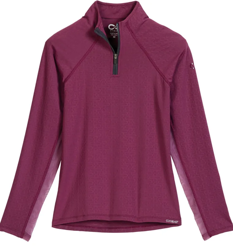 It wicks moisture away from theskin, converts it to a cooling sensation, dries quickly and provides ample stretch for riding. Raglan sleeves with mesh under-sleeve panels enhance breathability and comfort. Stand collar to shield the back of the neck; quarter-zip placket.