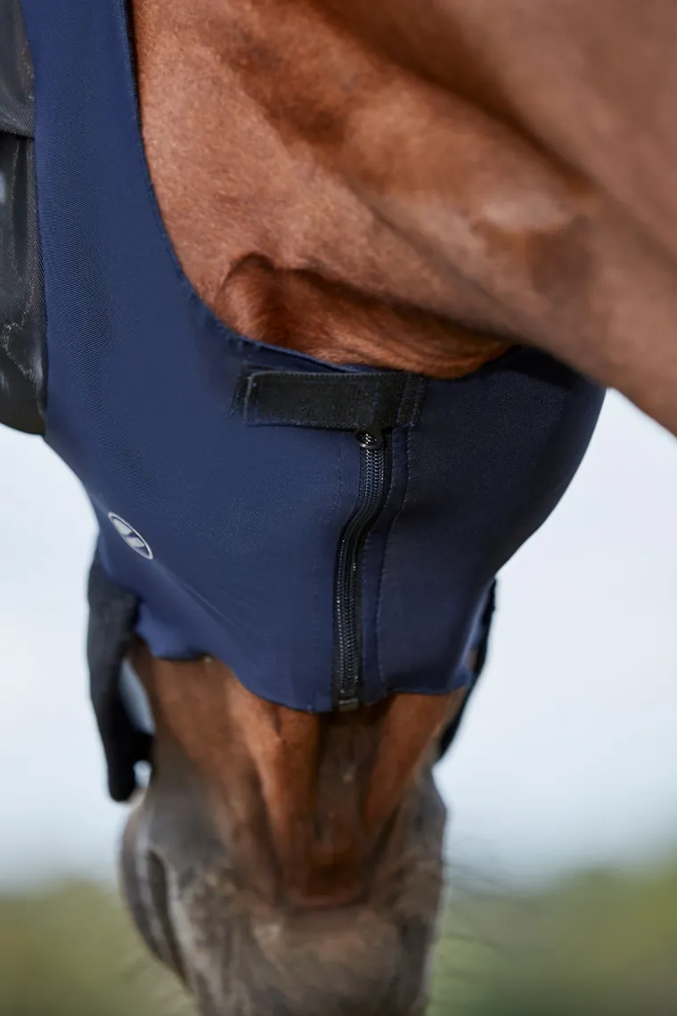 The WeatherBeeta® ComFiTec™ Luxe Bug Eye Saver with Ears & Nose is an extra-special bug-eye fly mask. The fine mesh over the sensitive eye area is stiffer than most to stand out further and resist collapse. A zipper under the jaw makes the mask easy to put on and take off. A 98%+ UV block makes it ideal for horses with sun sensitivity.
