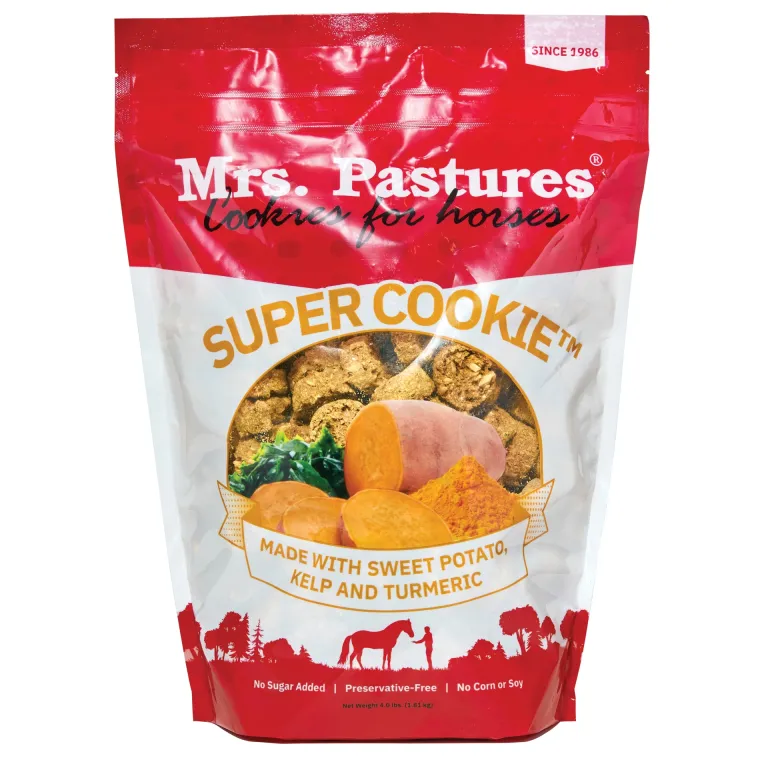 Introducing the Mrs. Pastures Super Cookie! Our new recipe is made with the same time-tested process as the original Mrs. Pastures horse cookie. We are proud to now offer an additional cookie option for your horse that is made with no molasses or other added sugar. Featuring sweet potatoes, turmeric and kelp—super foods for a Super Cookie! This new recipeis sure to become a barn favorite.