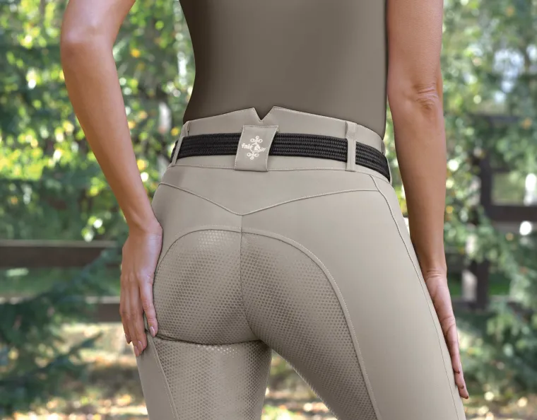The Fair Play® Jasmine Full-Seat Breech delivers a classic fit with a flattering high waist and a V-shape notch at the back waistband. Tailored in four-way stretch fabric, it offers maximum grip with a COMFISTICK™, innovative technology in an anti-slip, abrasion-resistant gel print.
