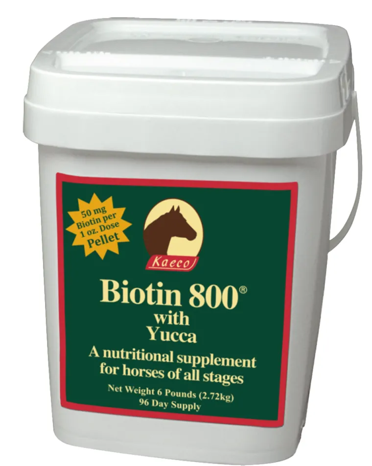 Biotin 800 Pellets are a very palatable, extra strength supplement formulated with key ingredients required to optimize the general condition of hooves, skin and hair coat. Concentrated for economical administration, each 1 ounce scoop provides 50mg d-biotin, 25mg dl-methionine, 460mg pantotenic acid and 500 mg yucca schidigera in a tasty base of yeast culture and distillers grains with solubles. Adult horses: 1-2 scoops daily; foals 1 scoop daily, lactating mares 2 scoops daily or as directed by a veterinarian.