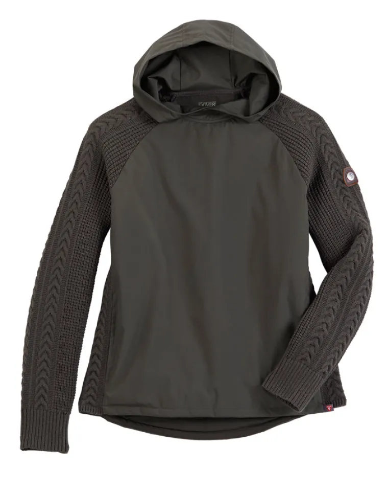The DS Athens Sweater is a hybrid, hooded style that boosts warmth at your core. Breathable cable-knit thumbhole sleeves and side panels keep you cozy and allow freedom of movement. A padded, quilted body insulates your core and offers water and wind repellency.