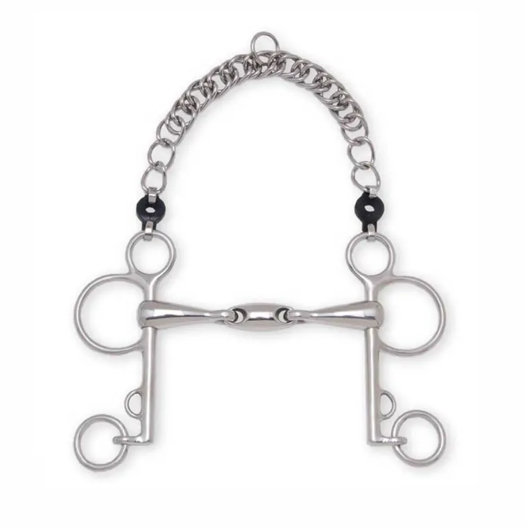 The Metalab Double-Jointed with Oval Link Pelham is a Level 3 bit in stainless steel. It features a double-jointed, oval link mouthpiece with 20mm diameter. Cheeks are 5 1/4″; 1 3/4″ bottom cheek piece.