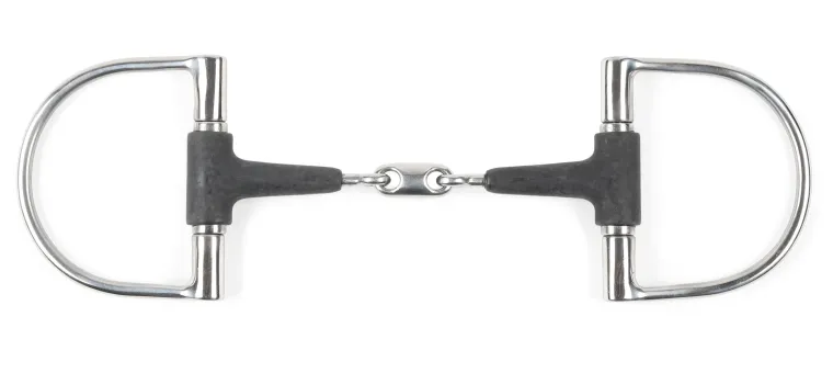 The Equikind+ Hunter Dee Bit with Lozenge has a 13mm three-piece mouthpiece with athin rubber coating. The rubber makes it milder than a traditional metal bit as it softer on the horse’s bars and lips. The lozenge liesnicely on the tongue and offers mild tongue pressure. D-rings are a classic design that can assist with sideways stability in the mouth. Rings are 90mm.