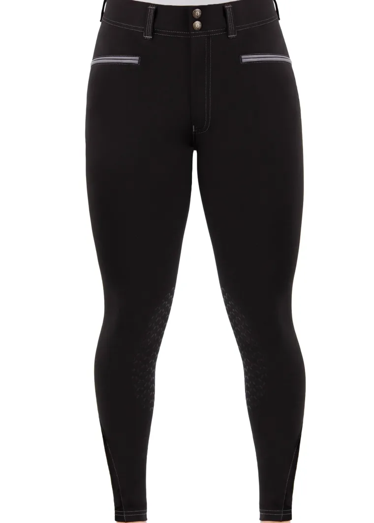 Traditional front zipper and belt loop styling is set off by modern contrast stitching. The horsehead tread silicone knee patches provide comfortable grip. Stretch panel bottoms let this breech fit smoothly inside boots.