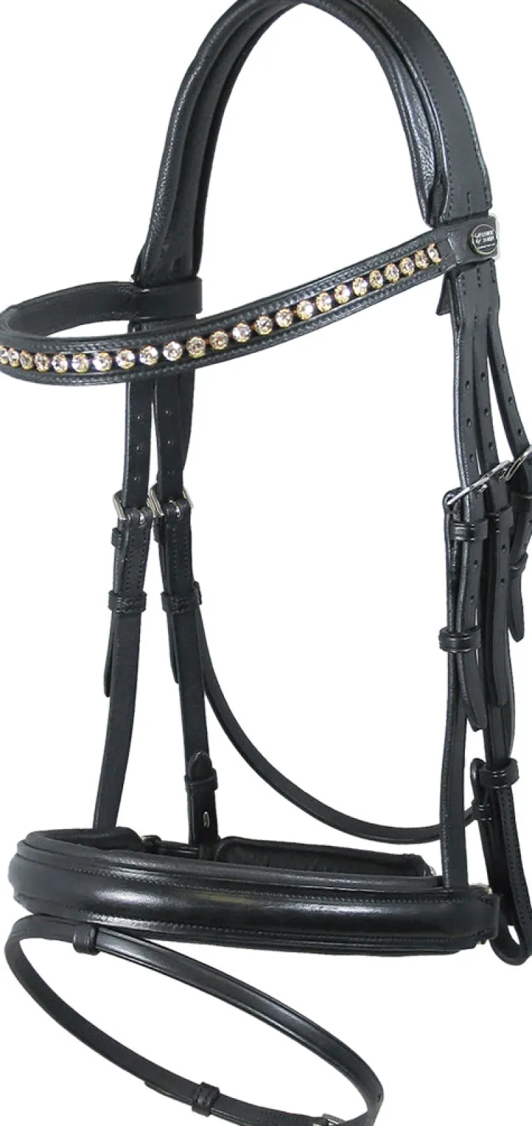 Made with the finest leather, theFortuna Bridle boasts a softly lined caveson, stainless steel fittings and elegant crystals in the browband. It also includes web reins with leather hand grips, rein stops and hook stud closures, sized to match the bridle size.