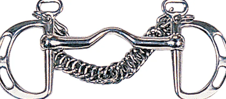 The Suffolk™ Uxeter KimberwickBit features a solid mouthpiece that has a medium port. This bit provides some leverage action. Cheeks provide slots for a choice of rein location. Made of stainless steel. Includes a curb chain and hooks.