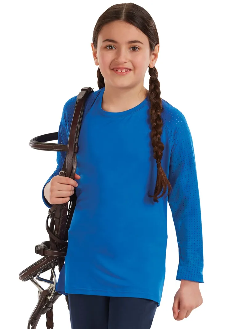 This sporty top has raglan sleeve construction to remove shoulder seams that can feel restrictive. A curved back lets it work beautifully in providing coverage as the young rider moves.