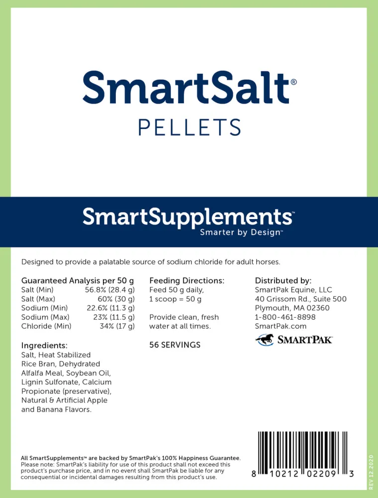 SmartEquine™ SmartSalt Pellets provide a palatable source of salt (sodium chloride) to help your horse stay healthy and hydrated. These apple-banana flavored pellets provide one ounce of sodium chloride per serving and are perfect for picky eaters! SmartSalt Pellets are ideal for all horses, to help meet their daily sodium requirement.