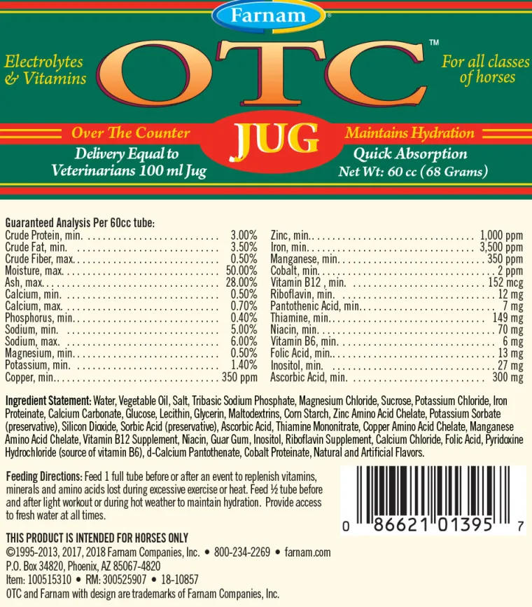 Farnam® OTC Jug™ is an electrolyte and vitamin paste for all classes of horses. Made in the USA, OTC Jug is quickly absorbed by the horse’s body, where it helps replenish vitamins, minerals, amino acids and electrolytes lost through sweat and bodily functions. It also helps maintain normal hydration.