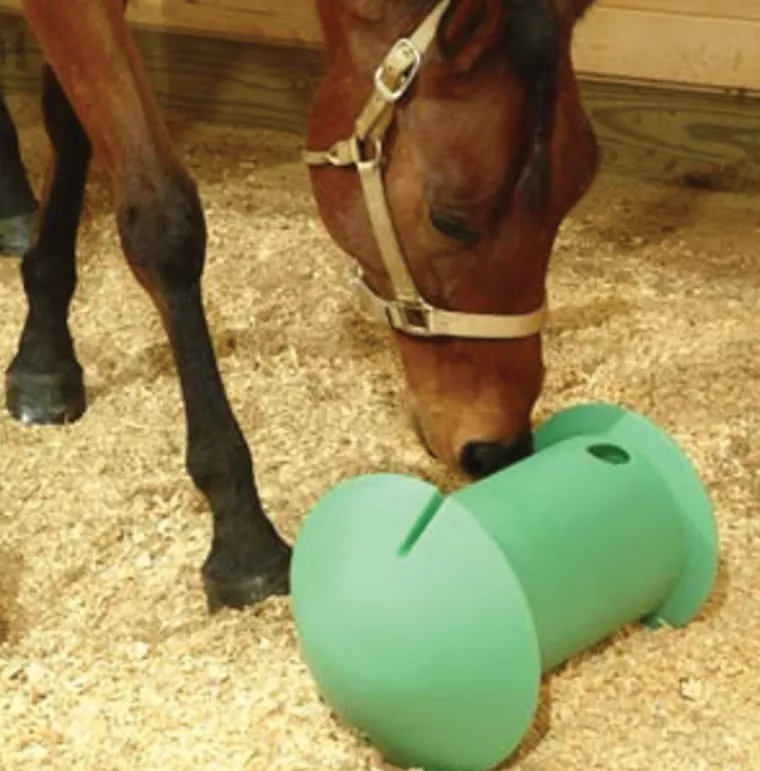 Fill the Amazing Graze with cut-up apples, carrots, hay cubes or other goodies and let your horse be rewarded by play! This treat-dispensing toy keeps your horse occupied in stall or paddock to reduce boredom that leads to mischief and vices. Made of durable polyethylene, it has a small opening that allows treats to spill out when your horse pushes it with his nose. It’s designed to roll in circles and to help maintain a natural grazing posture. The bottom twists off for easy filling and cleaning, then remains securely closed during play. Horses should not be left unsupervised with toy. 20″ long.