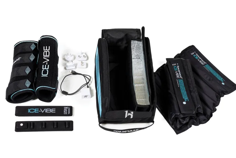 The newly improved Horseware® Ireland ICE-VIBE® Leg Wraps offer a combination of cold therapy and massage with enhanced fit and functionality, making them even more effective and user-friendly for horse owners. Designed with durability and convenience in mind, the boots now feature upgraded Velcro® closures with rubber grip tabs, ensuring a secure and adjustable fit. The durable neoprene construction includes elasticated panel pockets that house the innovative massage panels, which provide gentle, targeted therapy to support circulation and recovery. The easy-to-use button and light system allow users to choose from three intensity settings, delivering customized therapy based on their horse’s needs. Additionally, the updated product tote now includes a dedicated compartment to keep ice packs cold during transport, making it a must-have for barn use or competitions. The toteincludes two boots, two cold packs, two massage panels, one charger & a lightweight storage bag that is also a cooler to keep packs cold on the go. Ice-Vibe® boots may help to reduce inflammation, promote healing, and support overall leg health.
