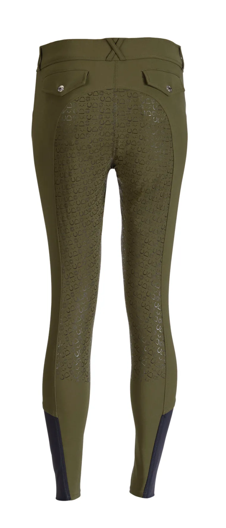 Single-layer, high-stretch calf panels provide a custom fit, eliminate bulk inside boots and allow easy on/off. Front slash pockets and functional back pockets are made of low-profile stretch material for a no-show appearance on the outside and enhanced comfort on the inside. The silicone print full seat features a stylish equestrian design that provides flexible grip.
