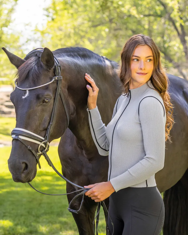 Kastel Denmark Ladies’ Mock Neck Knit Sweater is ready for all your riding needs. Dalia debuts with a black, sporty piping for an elevated look. Tailored fit with a mock neck and super soft, lightweight rib knit fabricthatkeeps you looking great all season long.