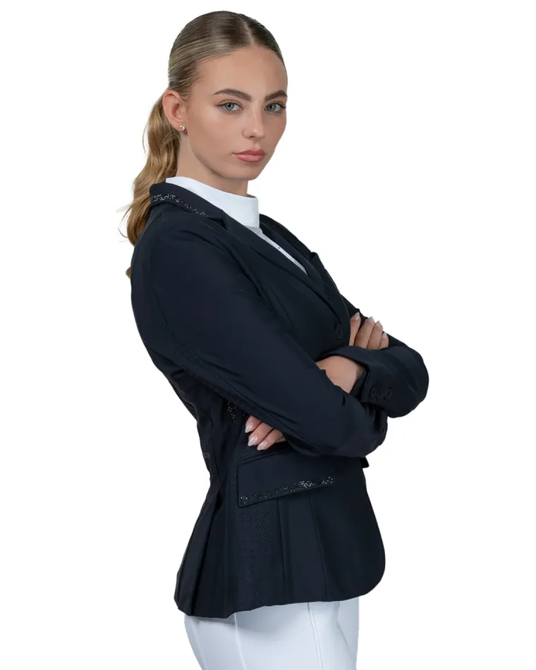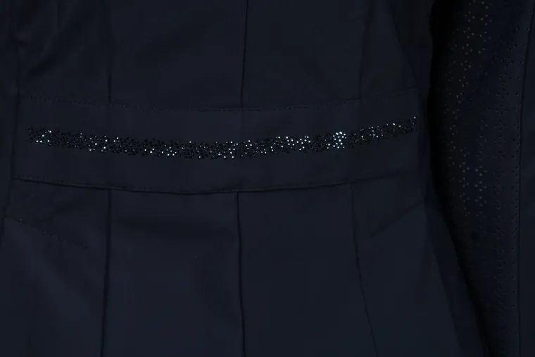 Fashionable, functional and ready to perform, the competition jacket has been elevated with the SchockemöhleLadies’ SpAlaine Show Coat. Piped pockets with flaps and rhinestone decoration for a flattering look in the saddle, perforated side panels with dividing seams and back bar at the back. Walking slits, rhinestone decoration on the collar and back bar. Buttons and a concealed zipper closethe jacket with a clean silhouette.Logo rubber badge on the sleeve announces Schockemöhlesophistication.