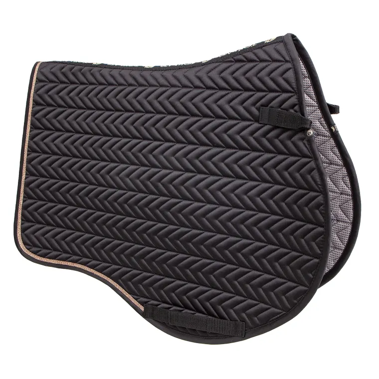 Shaped to fit jump saddles, the Toklat® Tango Chevron Close Contact Pad features a luxurious satin top, a classic chevron quilt pattern and shimmering metallic gold trim. It is lined with soft, eco-friendly bamboo fabric that is naturally antibacterial, antifungal and moisture-wicking.