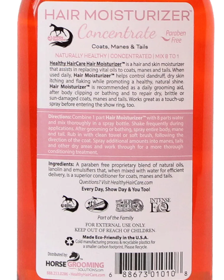 The Healthy Haircare™Hair Moisturizer Concentrate mixes with water into atherapeutic, lanolin enriched leave-in conditioner for horses. It assists in replacing vital oils to the horse′s hair and skin. Silicone and alcohol-free, this conditioner won′t irritate sensitive skin. Daily use of this product helps to control dandruff and dry skin, making it great for helping with blanket rubs, mane and tail itching. Pint.
