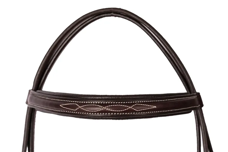 Fancy white stitching accents raised paneling on the browband, noseband and rein fronts. Padded for horse comfort in the all the right spots, it is fitted with durable stainless steel hardware, including hook stud closures.
