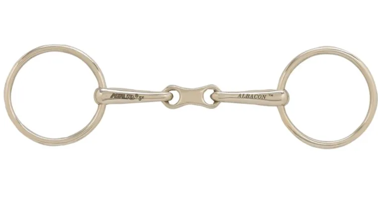 TheAlBaCon™ French Link Bradoon Bit is made from copper enhanced German Silver to help stimulate salivation and encourage bit acceptance. The high copper formula also helps prevent dry mouth, yet retains the appearance and durability of German Silver. 13mm mouthpiece with 55mm rings.