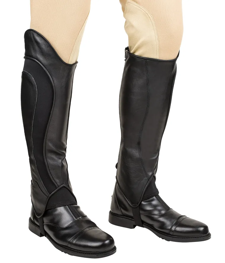 Form and function combine in the stylish and comfortable TuffRider® Men’s Derby Leather Half Chap. Crafted with textured, durable leather and flexible neoprene, this striking design contours to the shape of your leg securely and comfortably.