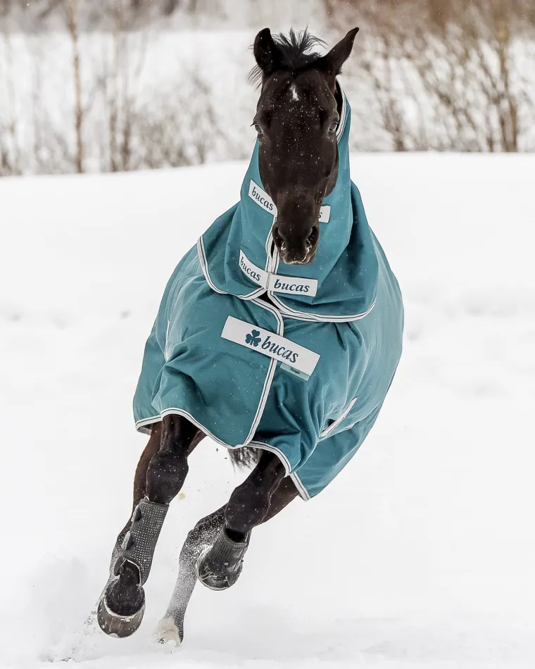 Styled with neck darts for a comfortable fit at the front, this mid-weight blanket has the Click and Go with magnetic snap-lock closure, cross surcingles, leg straps, tail string and tail flap. Attachments allow the addition of the Atlantic Combi Neck cover, sold separately. It can also be used with Bucas Quilts and Coolers.