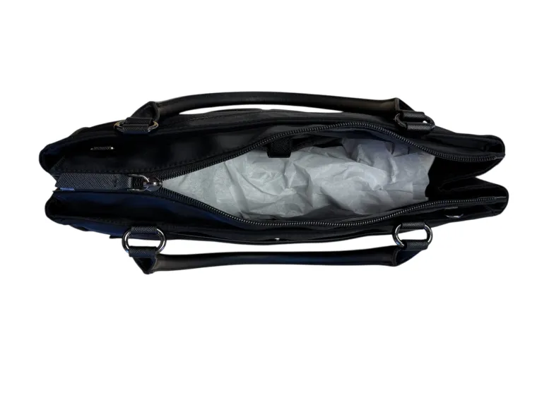 Carry your equestrian style to your work spaces and beyond with the Tucker Tweed Equestrian™ Medium Office Tote. This nylon/leather upscale tote is a pocket powerhouse! Interior pockets for laptop, drink, phone, cords and more. Exterior completed with gunmetal hardware, matching zipper pockets both front/back and trolley sleeve. Includes adjustable shoulder strap.Fits 13″ PC/14″ MacBook laptop.