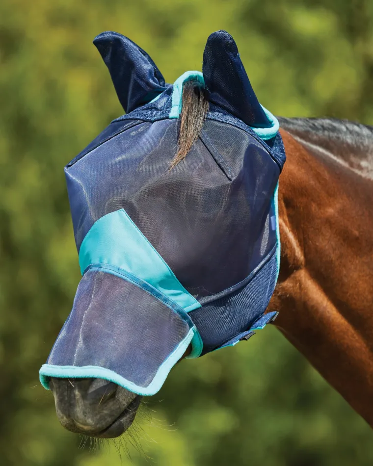 The WeatherBeeta® ComFiTec™ Deluxe Fine Mesh Fly Mask with Ears & Nose allows your horse full vision while blocking 60%+ of ultraviolet rays from skin and eyes—even the muzzle is shielded from sun. The fine mesh provides protection from the smallest insects, and an air stream ear cover design keeps insects out while allowing ventilation. Double-dart construction keeps the mask out of your horse’s eyes for a superb fit.