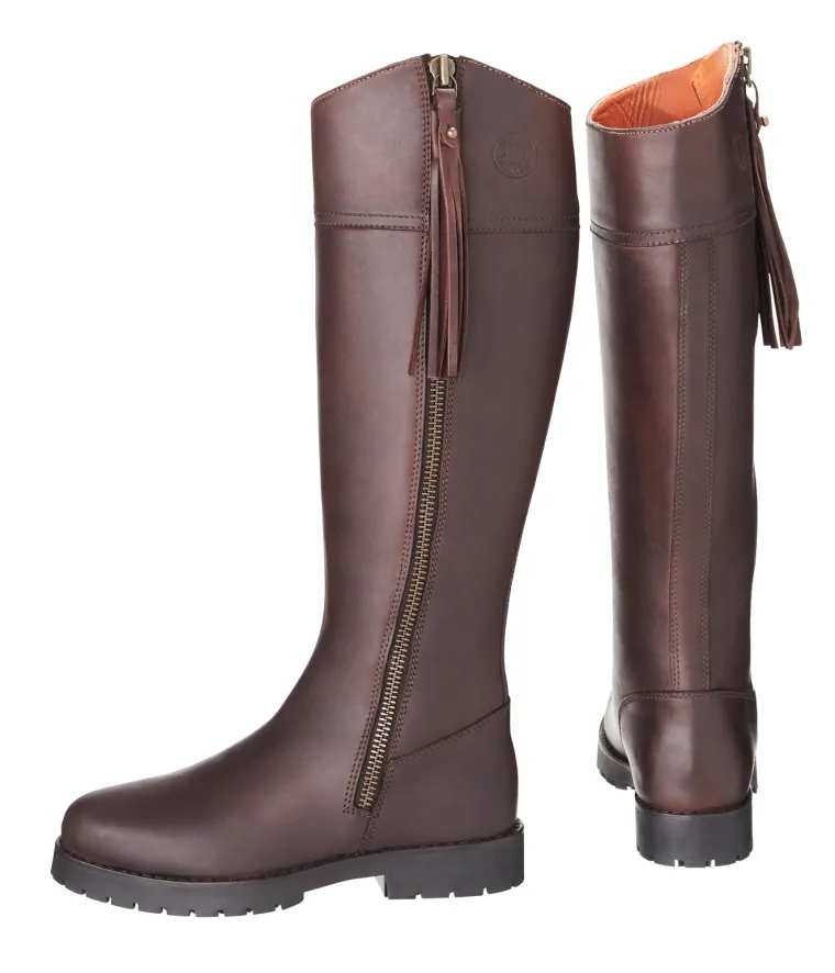 The waterproof Dandridge Tall Boot fits seamlessly into your country lifestyle. An attractive alternative to a muck boot, it is handcrafted in Portugal from beautiful quality Portuguese leather in a rich mahogany color. A specialtreatment added during tanning along with a waxed coating allows the leather to repel water. A German-engineered Sympatex waterproof membrane inside keeps you dry from foot to cuff.