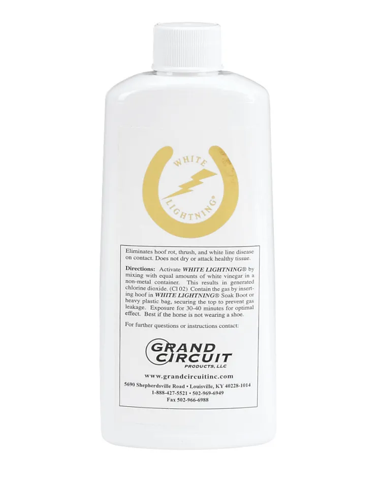 Thrush, hoof rot and white line disease are effectively treated with Grand Circuit White Lightning®. This hoof remedy when combined with equal parts of white vinegar, produces chlorine dioxide which very aggressively neutralizes bacteria, fungus and yeast and will not dry out or attack healthy tissue. 8 oz.
