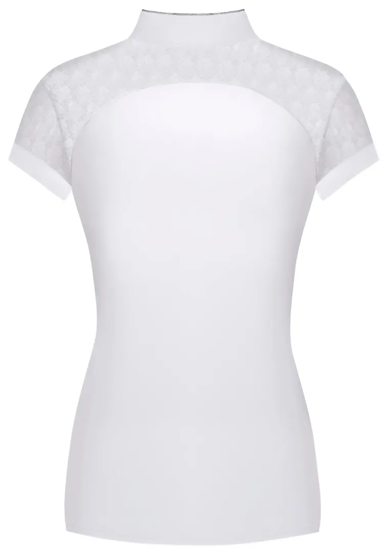 Elastic lace on the sleeves and front and back shoulders is a feminine touch that also adds airflow. Shimmering piping trims the collar, four-button placket and front shoulders. This competition top is proudly made in Poland and suited for formal lessons and clinics as well as shows.