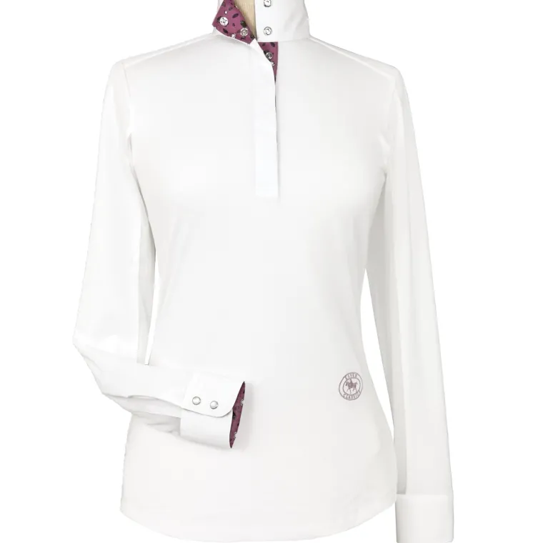 Essex Classics Ladies’ Talent Yarn Long-Sleeve Show Shirt is tailored in easy pullover style with a gently tapered body fit for a neat appearance with or without your show coat. Unsnap the collar and turn back the cuffs to show our exclusive fabric trim. Smart, thermoregulating technology helps maintain an optimal body temperature. Moisture wicking and deodorizing antimicrobial properties provide quick dry and stay fresh benefits that never wash out. Stain resistance helps keep your shirt looking new wash after wash. Breathable, stretch Talent Yarn keeps you comfortable in the saddle all day and the tapered fit, tucks easily into breeches (and stays tucked!).