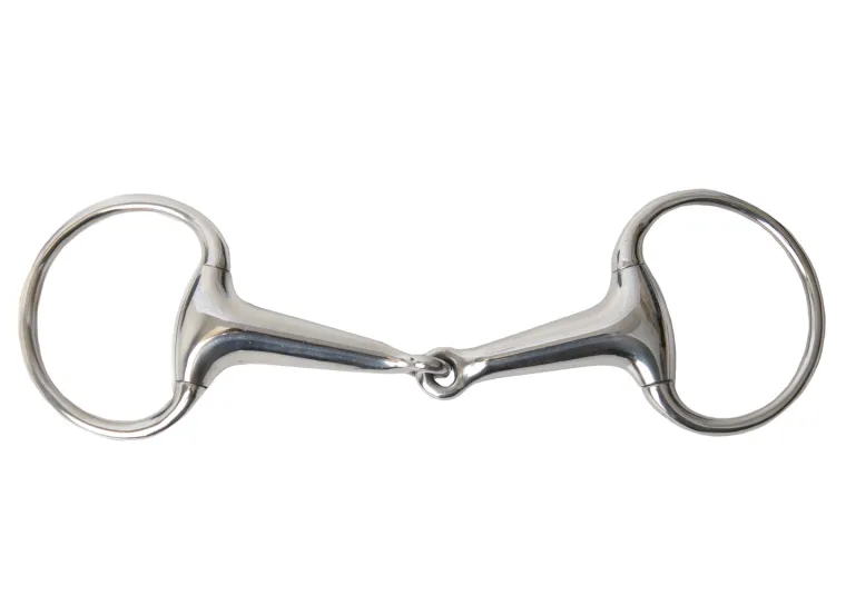 The Lightweight Hollow Mouth Eggbutt Snaffle Bit has a 23mm mouthpiece. This design provides a thick mouth, but without the weight that would otherwise be provided by a solid, thick mouth. The cheeks provide sideways stability in the horse’s mouth.