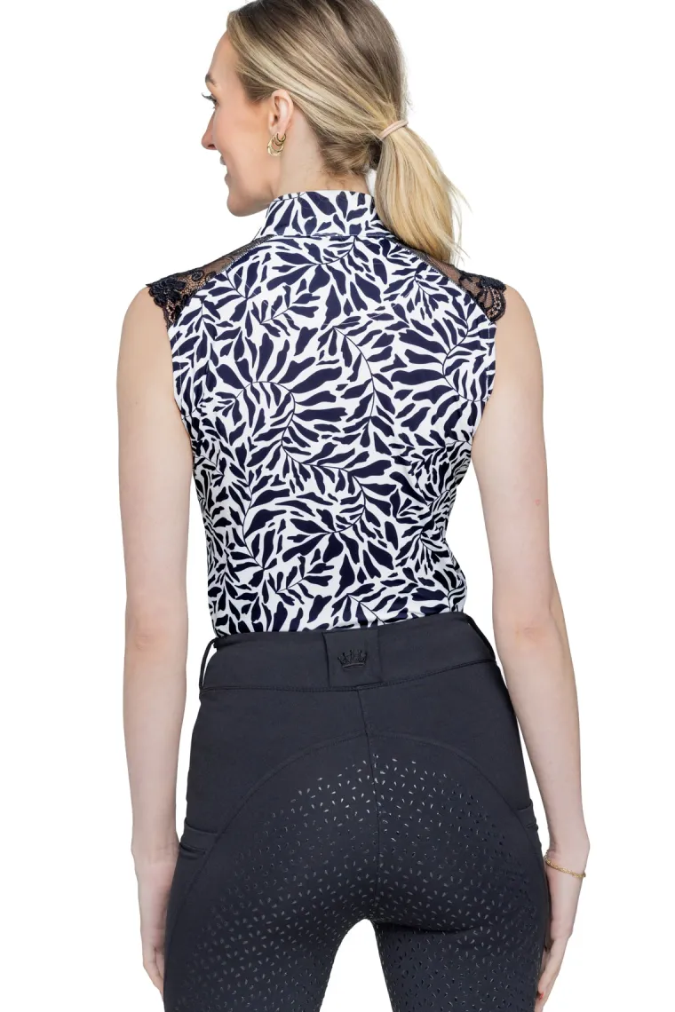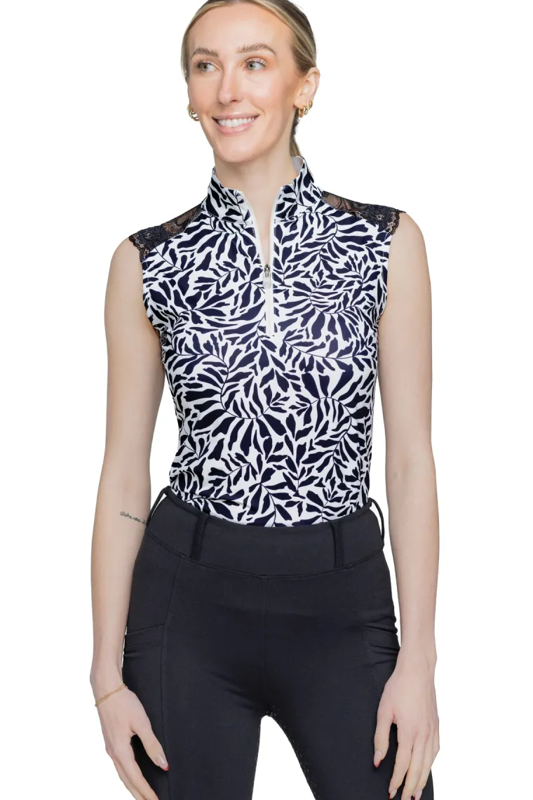 Contemporary Kastel Denmark Rue Sleeveless Shirt. Blackand white vine print paired with soft, stretchy four-way stretch. The feminine black lace makes our comfortable and versatile tank an true standout. UPF 30 bodice, 1/4 zip, soft 4-way stretch fabric in a modern fit.