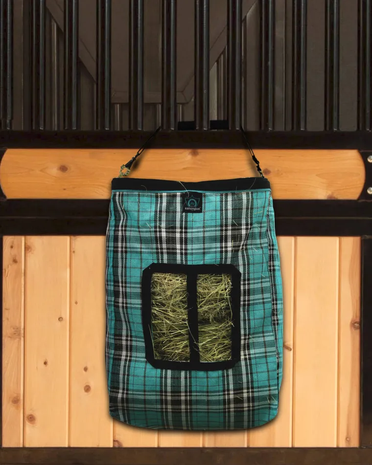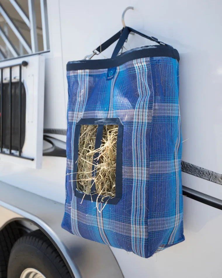 Perfect for trailer or show, this Kensington™ Hay Bag holds two large flakes of hay. Made of Textilene® all-weather woven PVC-coated polyester. Plastic rim with nylon webbing along top makes filling easy. Adjustable nylon strap and swivel snap for hanging or carrying.