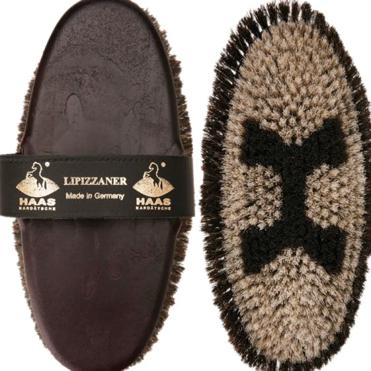The HAAS® Lipizzaner brush for horses is also known as the HAAS® Lippizaner Damen (ladies) brush for its smaller size. It is made with an exclusive horse hair mixture with longer black horse hair on the border designed for maximum dust removal and giving gloss while the shorter bristles in the center provide a gentle cleaning and lasting shine. 8” x 3 1/4”. Modern technology production incorporates the bristles directly within the body of the brush to eliminate the use of nails, spikes, screws or glue, ensuring exceptional longevity and safety of horse and rider. The longevity of brushes is guaranteed – a good reason to choose HAAS®. Made in Germany.